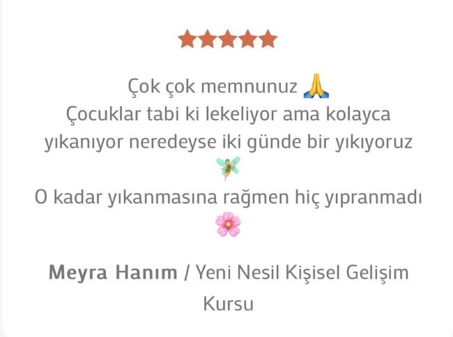 “Çok çok memnunuz 🙏 Çocuklar tabi ki lekiliyor ama kolayca yıkanıyor, neredeyse iki günde bir yıkıyoruz. O kadar yıkanmasına rağmen hiç yıpranmadı. 🧚♀️🌸”